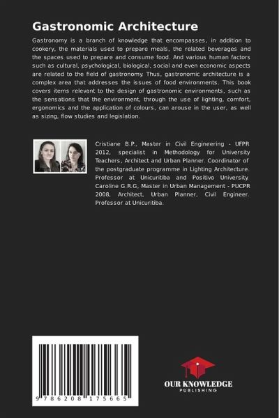 Gastronomy is a branch of knowledge that encompasses, in addition to cookery, the materials used to prepare meals, the related beverages and the spaces used to prepare and consume food. And various human factors such as cultural, psychological, biological, social and even economic aspects are related to the field of gastronomy. Thus, gastronomic architecture is a complex area that addresses the issues of food environments. This book covers items relevant to the design of gastronomic environments, such as the sensations that the environment, through the use of lighting, comfort, ergonomics and the application of colours, can arouse in the user, as well as sizing, flow studies and legislation.