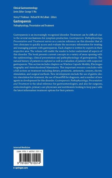 Gastroparesis is an increasingly recognized disorder. Treatment can be difficult due to the several mechanisms for symptom production. Gastroparesis: Pathophysiology, Presentation and Treatment serves as a concise reference on this disorder that allows clinicians to quickly access and evaluate the necessary information for treating and managing patients with gastroparesis. Each chapter is written by experts in their respective area. The volume will enable the reader to better understand all aspects of this disorder. The book presents current concepts in a variety of areas opening with the epidemiology, clinical presentation and pathophysiology of gastroparesis. The natural history of patients is explored as well as evaluation of patients with suspected gastroparesis. This section includes chapters on Wireless Capsule Motility, Electrogastrography and Antroduodenal Manometry. This important resource concludes with a full section on treatment including dietary, prokinetic, antiemetic,sensory, electric stimulation, and surgical methods. New developments include the use of gastric electric stimulation for treatment, the use of SmartPill for diagnosis, and a number of new agents in development for this disorder. Gastroparesis: Pathophysiology, Presentation and Treatment is the ideal reference for gastroenterologists, and also for surgeons, endocrinologists, primary care physicians and nutritionists looking to keep pace with the latest information treatment options for their patients.