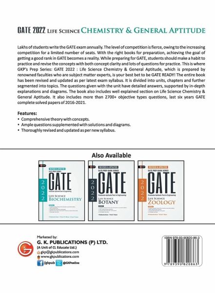 Lakhs of students write the GATE exam annually. The level of competition is fierce, owing to the increasing competition for a limited number of seats. With the right books for preparation, achieving the goal of getting a good rank in GATE becomes a reality. While preparing for GATE, students should make a habit to practice and revise the concepts with both concept clarity and lots of questions for practice. This is where GKP's Prep Series: GATE 2022: Life Science Chemistry & General Aptitude, which is prepared by renowned faculties who are subject matter experts, is your best bet to be GATE READY! The entire book has been revised and updated as per the latest exam syllabus. It is divided into units, chapters and further segmented into topics. The questions given with the unit have detailed answers, supported by in-depth explanations and diagrams. The book also includes a well-explained section on Life Science Chemistry & General Aptitude. It also includes more than 2700+ objective types questions, last six years GATE complete solved papers of 2016-2021. Features: Comprehensive theory with concepts. Ample questions supplemented with solutions and diagrams. Thoroughly revised and updated as per the new syllabus.