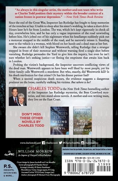 Since the end of the Great War, Inspector Ian Rutledge has fought to keep memories of the trenches at bay. Unable to sleep after his sister’s wedding, he takes a short drive. Hours later he’s far from London. The war, which he’s kept rigorously in check all day, overwhelms him, and he has only a vague impression of the road unwinding before him. He’s jolted out of his nightmare when his headlamps suddenly pick out a motorcar stopped in the middle of the road, and he narrowly misses it. Standing next to the vehicle is a woman, with blood on her hands and a dead man at her feet. She swears she didn’t kill Stephen Wentworth, telling Rutledge that a stranger stepped in front of their motorcar and without warning fired a single shot before vanishing. Rutledge persuades the Yard to give him the inquiry, but even he isn’t sure whether he’s seeking justice—or fleeing the emptiness that awaits him back in London. Probing the victim’s background, the Inspector uncovers conflicting views of the dead man. Wentworth appears to have been well liked by most people, yet his bitter family calls Wentworth a murderer. But who, exactly, did Wentworth kill? Is his death retribution for that crime? Or has his dinner partner lied? When a second suspicious death occurs, the evidence suggests a dangerous predator on the loose, carefully stalking his victims. But where is he?