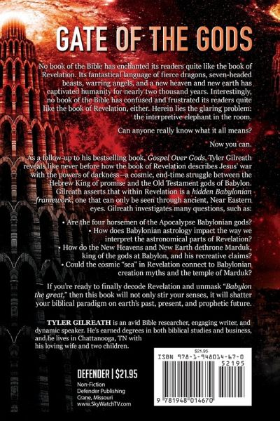 No book of the Bible has enchanted its readers quite like the book of Revelation. Its fantastical language of fierce dragons, seven-headed beasts, warring angels, and a new heaven and new earth has captivated humanity for nearly two thousand years. Interestingly, no book of the Bible has confused and frustrated its readers quite like the book of Revelation, either. Herein lies the glaring problem: the interpretive elephant in the room. Can anyone really know what it all means? Now you can. As a follow-up to his bestselling book, Gospel Over Gods, Tyler Gilreath reveals like never before how the book of Revelation describes Jesus' war with the powers of darkness-a cosmic, end-time struggle between the Hebrew King of promise and the Old Testament gods of Babylon. Gilreath asserts that within Revelation is a hidden Babylonian framework, one that can only be seen through ancient, Near Eastern eyes. Gilreath investigates many questions, such as: · Are the four horsemen of the Apocalypse Babylonian gods? · How does Babylonian astrology impact the way we interpret the astronomical parts of · Revelation? · How do the New Heavens and New Earth dethrone Marduk, king of the gods at Babylon, · and his recreative claims? · Could the cosmic "sea" in Revelation connect to Babylonian creation myths and the temple of Marduk? If you're ready to finally decode Revelation and unmask "Babylon the great," then this book will not only stir your senses, it will shatter your biblical paradigm on earth's past, present, and prophetic future.