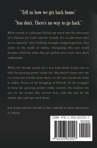 A dangerous world filled with magic. And now there's no way home. When Lydia and her friends get trapped after an earthquake, their only chance for survival is walking through the mysterious gateway they find deep within the mountains. They arrive in the world of Adylra. A land of magic, unicorns, and danger. When the gateway back home disappears, they find themselves stranded and searching for a way back. As Lydia struggles with the growing power inside her Aidric, the Prince of Thavell, discovers her secret. Together they work to unlock the mysteries of her magic. But the more Lydia learns, the more she realizes the prince and the king may have their own plans for her magic. As alliances strain and her friends are thrust into dangerous situations, the answer to how to get home eludes them. And Lydia worries what will happen when her friends find she's the reason they're lost. And she may be the reason they can't get back home.
