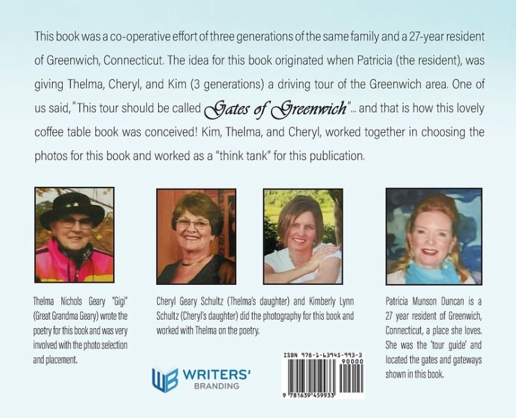 Synopsis: This book was a co-operative effort of three generations of the same family and a 27-year resident of Greenwich, Connecticut. The idea for this book originated when Patricia (the resident) was giving Thelma, Cheryl, and Kim (3 generations) a driving tour of the Greenwich area. One of us said, "This tour should be called Gates of Greenwich" ... and that is how this lovely coffee table book was conceived! Kim, Thelma, and Cheryl, worked together in choosing the photos for this book and worked as a "think tank" for this publication. Autobiography: Thelma Nichols Geary "Gigi"(Great Grandma Geary) wrote the poetry for this book and was very involved with the photo selection and placement. Cheryl Geary Schultz (Thelma's daughter) and Kimberly Lynn Schultz (Cheryl's daughter) did the photography for this book and worked with Thelma on the poetry. Patricia Munson Duncan is a 27 years resident of Greenwich, Connecticut, a place she loves. She was the 'tour guide' and located the gates and gateways shown in this book.