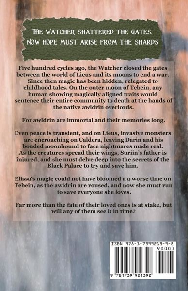 The Watcher shattered the Gates. Now hope must arise from the shards. The Watcher shattered the gates. Now hope must arise from the shards. Five hundred cycles ago, the Watcher closed the gates between the world of Lieus and its moons to end a war. Since then, magic has been hidden, relegated to childhood tales. On the outer moon of Tebein, any human showing magically aligned traits would sentence their entire community to death at the hands of the native awldrin overlords. For awldrin are immortal and their memories long. Even peace is transient, and on Lieus, invasive monsters are encroaching on Caldera, leaving Darin and his bonded moonhound to face nightmares made real. As the creatures spread their wings, Suriin's father is injured, and she must delve deep into the secrets of the Black Palace to try to save him. Elissa's magic could not have bloomed at a worse time on Tebein; the awldrin are roused, and now she must run to save everyone she loves. Far more than the fate of their loved ones is at stake, but will any of them see it in time?