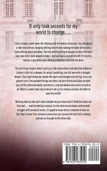 It only took seconds for my world to change... I live a simple, small-town life. Helping with the family restaurant, my side gig as a ride-share driver, hanging with my best friend, making the most of the extra time with my ghost grandma. The only exciting thing to happen to me in the past year was when Gabe moved to town-too bad Nonna scared him off. It's hard to impress a guy when your dead grandmother calls him the devil. The last thing I expect when I pick up a ride-share client and take him to Mannix Estate is that he's a demon. An actual, breathing, can-kill-me-with-a-thought demon. That night blows my simple life apart and changes everything. Turns out, ghosts aren't the weirdest things out there, my best friend and Gabe are both part of this alternate world, and there's a big bad demon who wants to end us all. What's a small-town boy to do but roll up his sleeves and join the fight to save the world? Working side by side with Gabe reminds me just how much I liked him when we first met... and the feeling's mutual. As the clock counts down and we both struggle with personal issues, it's good to know there's someone to lean on. But I don't know if our tenuous connection can survive the hell that's coming and see us through to the other side.