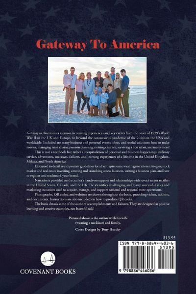 Gateway to America is a memoir recounting experiences and key events from the onset of 1939's World War II in the UK and Europe, to beyond the coronavirus pandemic of the 2020s in the USA and worldwide. Included are many business and personal events, ideas, and useful solutions: how to make movies, managing retail chains, pension planning, making clear ice, surviving a lion safari, and many more! This is not a textbook but rather a recapitulation of personal and business happenings, military service, adventures, successes, failures, and learning experiences of a lifetime in the United Kingdom, Malaya, and North America. Discussed in detail are important guidelines for all entrepreneurs: wealth generation strategies, stock market and real estate investing, creating and launching a new business, writing a business plan, and how to register and trademark your brand. Narrative is provided on the author's hands-on support and relationships with several major retailers in the United States, Canada, and the UK. He identifies challenging and many successful sales and marketing initiatives used to acquire, manage, and support national and regional store operations. Photographs, QR codes, and websites are shown throughout the book, providing videos, exhibits, and documents. Instructions are also included on how to produce QR codes. The book details some of the author's accomplishments and failures. They are designed as positive learning and creative examples, not boastful talk!