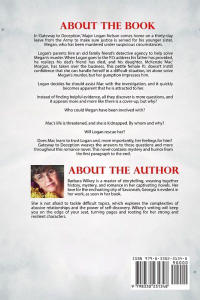 In 'Gateway to Deception,' Major Logan Nelson comes home on a thirty-day leave from the Army to make sure justice is served for his younger sister, Megan, who has been murdered under suspicious circumstances. Logan's parents hire an old family friend's detective agency to help solve Megan's murder. When Logan goes to the P.I.'s address his father has provided, he realizes his dad's friend has died, and his daughter, McKenzie 'Mac' Morgan, has taken over the business. This petite female P.I. doesn't instill confidence that she can handle herself in a difficult situation, let alone solve Megan's murder, but her gumption impresses him. Logan decides he should assist Mac with the investigation, and it quickly becomes apparent that he is attracted to her. Instead of finding helpful evidence, all they discover is more questions, and it appears more and more like there is a cover-up, but why? Who could Megan have been involved with? Mac's life is threatened, and she is kidnapped. By whom and why? Will Logan rescue her? Does Mac learn to trust Logan and, more importantly, her feelings for him? Gateway to Deception weaves the answers to these questions and more throughout this romance novel. This novel contains mystery and humor from the first paragraph to the end.