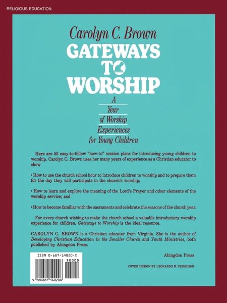 Here are 52 easy-to-follow "how-to" session plans for introducing young children to worship. Carolyn C. Brown uses her many years of experience as a Christian educator to show How to use the church school hour to introduce children to worship and to prepare them for the day they will participate in the church's worship; How to learn and explore the meaning of the Lord's Prayer and other elements of the worship service; and How to become familiar with the sacraments and celebrate the seasons of the church year. For every church wishing to make the church school a valuable introductory worship experience for children, Gateways to Worship is the ideal resource.