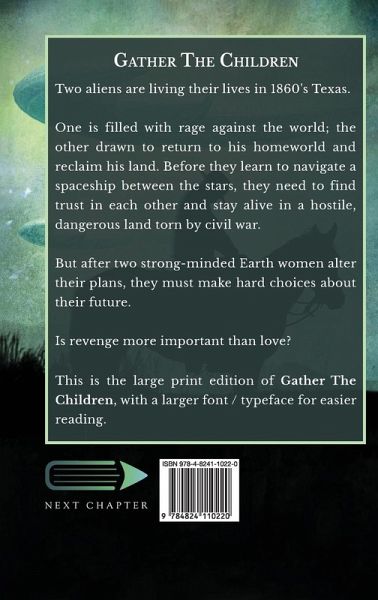 Two aliens are living their lives in 1860's Texas. One is filled with rage against the world; the other drawn to return to his homeworld and reclaim his land. Before they learn to navigate a spaceship between the stars, they need to find trust in each other and stay alive in a hostile, dangerous land torn by civil war. But after two strong-minded Earth women alter their plans, they must make hard choices about their future. Is revenge more important than love? This is the large print edition of Gather The Children, with a larger font / typeface for easier reading.