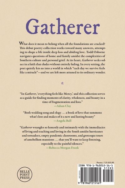 What does it mean to belong when all the foundations are cracked? This debut poetry collection works toward many answers, attempting to shape a life inside deep loss and abiding love. Todd Osborne navigates questions of home and family amidst the complexities of Southern culture and personal grief. At its heart, Gatherer seeks solace in a faith that eludes without entirely fading. In every setting, the poet quietly lets us into a world in which "each day we survive feels like a miracle"-and we are left more attuned to its ordinary wonder.