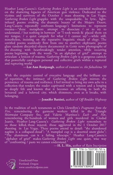 Gathering Broken Light confronts pasts we cannot understand, largely following the October 2017 mass shooting. Anchored in the severity and the beauty of the Mojave Desert landscape, fractured narratives, surrealist repetition, and imagistic lyricism work to contemplate grief, including both overwhelming sorrow and deep love. A voice yearns, "I wish I could sing the sky to you." In a collection that refuses to flatten the horrors of gun violence, both "flashing restless anger" and immense sadness, acknowledging that grief never leaves entirely, these poems also offer small comforts, even hope, as the "century plants continue to bloom // slowly, like stars burn" beneath a "moon as emptiness traced / and brimming with promise / because both can be true." To those lost, this collection insists, "You deserve to be remembered."