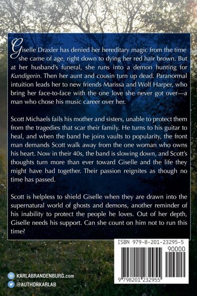Giselle Draxler has denied her hereditary magic from the time she came of age, including dying her red hair brown. But at her husband's funeral, she runs into a demon hunting for Kundigerin. Then her aunt and cousin turn up dead. Paranormal intuition leads her to new friends Marissa and Wolf Harper, who bring her face-to-face with the one love she never got over-a man who chose his music career over her. Scott Michaels fails his mother and sisters, unable to protect them from the tragedies that scar their family. He turns to his guitar to heal, and when the band he joins vaults to popularity, the front man demands Scott walk away from the one woman who owns his heart. Now in their 40s, the band is slowing down, and Scott's thoughts turn more than ever toward Giselle and the life they might have had together. Their passion reignites as though no time has passed. Scott is helpless to shield Giselle when they are drawn into the supernatural world of ghosts and demons, another reminder of his inability to protect the people he loves. Out of her depth, Giselle needs his support. Can she count on him not to run this time?