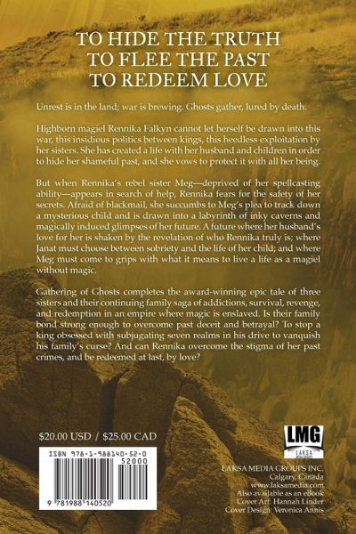 From the award-winning series comes the final chapter of sisterhood, survival, redemption, and love. TO HIDE THE TRUTHTO FLEE THE PASTTO REDEEM LOVE Unrest is in the land; war is brewing. Ghosts gather, lured by death. Highborn magiel Rennika Falkyn cannot let herself be drawn into this war, this insidious politics between kings, this heedless exploitation by her sisters. She has created a life with her husband and children in order to hide her shameful past, and she vows to protect it with all her being. But when Rennika's rebel sister Meg-deprived of her spellcasting ability-appears in search of help, Rennika fears for the safety of her secrets. Afraid of blackmail, she succumbs to Meg's plea to track down a mysterious child and is drawn into a labyrinth of inky caverns and magically induced glimpses of her future. A future where her husband's love for her is shaken by the revelation of who Rennika truly is; where Janat must choose between sobriety and the life of her child; and where Meg must come to grips with what it means to live a life as a magiel without magic. Gathering of Ghosts completes the award-winning epic tale of three sisters and their continuing family saga of addictions, survival, revenge, and redemption in an empire where magic is enslaved. Is their family bond strong enough to overcome past deceit and betrayal? To stop a king obsessed with subjugating seven realms in his drive to vanquish his family's curse? And can Rennika overcome the stigma of her past crimes, and be redeemed at last, by love?
