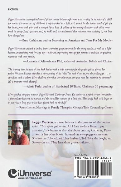 Peggy Warren has accomplished one of fiction's most delicate high-wire acts: writing in the voice of a child, for adults. The innocence of childhood is deftly evoked in a bold girl's search for the hardest kind of gift for her father, peace and quiet and a changed life to boot. A gallery of fascinating characters each offers some truth in young Zoey's journey and, by book's end, we understand that, without even realizing it, our lives have changed too. -Burt Rashbaum, author Becoming an American and Tears For My Mother Peggy Warren has created a tender, heart-warming, poignant book for the young reader, as well as a light-hearted, entertaining read for any age-with an empowering message for parents to evaluate the precious moments with their family. -Alexandra Delis-Abrams Phd, author of Attitudes, Beliefs and Choices The journey into the soul of this book begins with a child searching for the perfect gift to give to her father. We soon discover that this is the yearning of the "child" in each of us: to give the perfect gift ... to ourselves, and to others. How shall we give what we value most, not just once, but moment by moment? It's a treasure worth sharing! -Alexia Parks, author of Hardwired 10 Traits, Chairman 56percent.org How quickly the pages turn in Peggy Warren's Gathering Peace. The author is a gifted writer who strikes a fine balance between the naiveté and the incredible wisdom of a little girl. This lovely book will linger on in your heart long after it has been placed back on the shelf." -Rome Lester, Marriage & Family Therapist, Georgia Tech Counseling Center