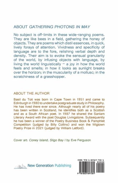 ABOUT GATHERING PHOTONS IN MAY No subject is off-limits in these wide-ranging poems. They are like bees in a field, gathering the honey of objects. They are poems which distil essences, in quick, lively forays of attention. Vividness and specificity of language are to the fore, relishing verbal depth and density. Their aim is to evoke the sensual granularity of the world, by infusing objects with language, by living the world linguistically - a joy in how the world feels and smells; in how it looks as sunlight breaks over the horizon; in the muscularity of a mollusc; in the scratchiness of a grasshopper. ABOUT THE AUTHOR Basil du Toit was born in Cape Town in 1951 and came to Edinburgh in 1980 to undertake postgraduate study in Philosophy. He has lived there ever since. Although nearly all of his poetry has been written in Scotland, he identifies both as a Scottish and as a South African poet. In 1987 he shared the Sanlam Literary Award with the poet Douglas Livingstone. Subsequently he has been a winner of the Poetry Business Book & Pamphlet Competition (judged by Billy Collins) and won the Wigtown Poetry Prize in 2021 (judged by William Letford).