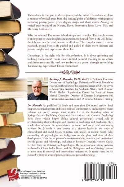 This volume invites you to share a journey of the mind. The volume explores a number of topical areas from the vantage point of different writing genre, including poetry, poetic lyrics, elegies, essays, and short stories. Among the topical areas included are Nature, Places, Innovative Ideas, Love, War, and Mortality Encounters. Why the volume? The answer is both simple and complex. The simple answer is an impluse to share insights and experiences gleaned from a life well-lived - the inherent teacher and mentor in all of us. The complex answer is more nuanced, arising from a life pushed and pulled to share more intimate and private insights and experiences about life. Gatherings, is the right title for this collection. It is about gathering and building connections! I want readers to find personal meaning in my words, and also to enter my life - to know me better as a person through my writing. To know my experiences! This is connection!