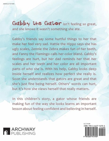 Gabby the Gator isn't feeling so great, and she knows it wasn't something she ate. Gabby's friends say some hurtful things to her that make her feel very sad. Hattie the Hippo says she has ugly scales, Zennie the Zebra makes fun of her teeth, and Fanny the Flamingo calls her color bland. Gabby's feelings are hurt, but her dad reminds her that her scales and her teeth and her color are all important parts of who she is. With his help, Gabby looks deep inside herself and realizes how perfect she really is. Soon she understands that gators are great and that she's just fine being herself. Others' words can hurt, but it's how she views herself that really matters. In this children's story, a gator whose friends are making fun of the way she looks learns an important lesson about feeling confident and believing in herself.