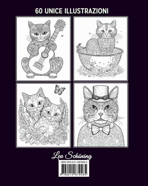 Gatti Mandala Libro da Colorare di Lea Schöning Gatti Mandala Libro da Colorare offre un modo unico per esprimere la propria creatività e allo stesso tempo favorire il rilassamento. Le pagine del libro contengono illustrazioni dettagliate di gatti in varie pose che vi aspettano per essere colorate. Ottimo per tutti i livelli di abilità Che siate principianti o artisti avanzati, questo libro da colorare è ideale per tutti coloro che amano i gatti. Ogni immagine è stata accuratamente progettata per permettervi di usare i colori e le tecniche che desiderate e di creare la vostra interpretazione. Le immagini sono create su una singola pagina Ogni immagine è collocata su una pagina a sé stante, in modo da non doversi preoccupare che si veda in trasparenza. Un grande regalo I nostri libri sono un ottimo regalo di compleanno per un amico, per la festa della mamma, per gli uomini, per Natale o per qualsiasi altro anniversario. Ordinate oggi stesso e lasciatevi ispirare da questo esclusivo libro da colorare sui gatti!