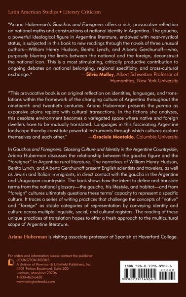 In Ariana Huberman's manuscript titled Gauchos and Foreigners: Glossing Culture and Identity in the Argentine Countryside, she discusses the relationship between the gaucho figure and the "foreigner" in Argentine rural literature from the turn of the nineteenth-century to the 1920's in order to explore the complexities of mutual cultural transformation in a literary genre and a region that thrives in binaries.