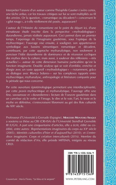 « Le livre de Mercedes Montoro Araque sur Gautier, au carrefour de l'âme romantique et décadente force l'admiration. Il révèle la connaissance très approfondie de l'auteur sur l'artiste romantique. Son analyse toujours fine et sensible s'appuie sur des outils théoriques qu'elle domine parfaitement et sur une culture incontestablement solide. Cette spécialiste de l'imaginaire révèle la richesse et la complexité de l'oeuvre de Gautier en montrant au lecteur avec précision à quel point le mythe introduit dans l'oeuvre littéraire étudiée une dimension polyphonique. Elle révèle la singularité de cette oeuvre à un moment carrefour de l'histoire littéraire tout en soulignant la force des représentations collectives dans l'écriture singulière. Grâce à cette herméneutique instauratrice, de la remythification Montoro Araque prouve brillamment que l'oeuvre de Gautier n'est pas un objet, un magasin d'images et de motifs, mais un trajet anthropologique que l'auteure replace en plus dans un mouvement littéraire fascinant, celui qui conduit Gautier, comme ses contemporains Jules Barbey d'Aurevilly, Baudelaire et même Flaubert, du romantisme au décadentisme. » -Gérard Peylet, Prof. Emerite Université Bordeaux" Le livre de Mercedes Montoro Araque sur Gautier, au carrefour de l'âme romantique et décadente force l'admiration. Il révèle la connaissance très approfondie de l'auteur sur l'artiste romantique. Son analyse toujours fine et sensible s'appuie sur des outils théoriques qu'elle domine parfaitement et sur une culture incontestablement solide. Cette spécialiste de l'imaginaire révèle la richesse et la complexité de l'oeuvre de Gautier en montrant au lecteur avec précision à quel point le mythe introduit dans l'oeuvre littéraire étudiée une dimension polyphonique. Elle révèle la singularité de cette oeuvre à un moment carrefour de l'histoire littéraire tout en soulignant la force des représentations collectives dans l'écriture singulière. Grâce à cette herméneutique instauratrice, de la remythification Montoro Araque prouve brillamment que l'oeuvre de Gautier n'est pas un objet, un magasin d'images et de motifs, mais un trajet anthropologique que l'auteure replace en plus dans un mouvement littéraire fascinant, celui qui conduit Gautier, comme ses contemporains Jules Barbey d'Aurevilly, Baudelaire et même Flaubert, du romantisme au décadentisme. " -Gérard Peylet, Prof. Emerite Université Bordeaux