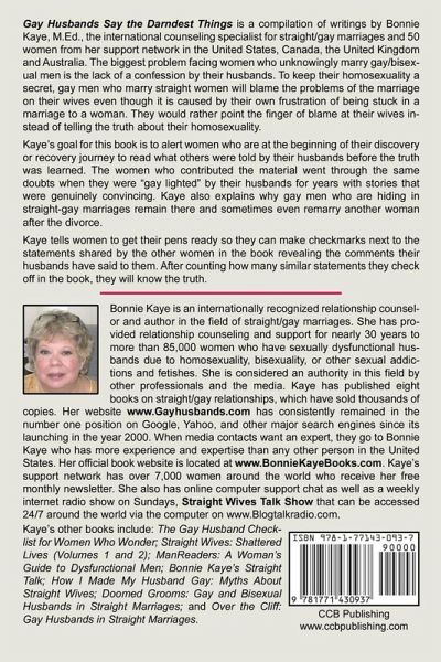 Gay Husbands Say the Darndest Things is a compilation of writings by Bonnie Kaye, M.Ed., the international counseling specialist for straight/gay marriages and 50 women from her support network in the United States, Canada, the United Kingdom and Australia. The biggest problem facing women who unknowingly marry gay/bisexual men is the lack of a confession by their husbands. To keep their homosexuality a secret, gay men who marry straight women will blame the problems of the marriage on their wives even though it is caused by their own frustration of being stuck in a marriage to a woman. They would rather point the finger of blame at their wives instead of telling the truth about their homosexuality. Kaye's goal for this book is to alert women who are at the beginning of their discovery or recovery journey to read what others were told by their husbands before the truth was learned. The women who contributed the material went through the same doubts when they were "gay lighted" by their husbands for years with stories that were genuinely convincing. Kaye also explains why gay men who are hiding in straight-gay marriages remain there and sometimes even remarry another woman after the divorce. Kaye tells women to get their pens ready so they can make checkmarks next to the statements shared by the other women in the book revealing the comments their husbands have said to them. After counting how many similar statements they check off in the book, they will know the truth. About the Author: Bonnie Kaye is an internationally recognized relationship counselor/author in the field of straight/gay marriages. She has provided relationship counseling and support for nearly 30 years to more than 85,000 women who have sexually dysfunctional husbands due to homosexuality, bisexuality, or other sexual addictions and fetishes. She is considered an authority in this field by other professionals and the media. Kaye has published eight books on straight/gay relationships, which have sold thousands of copies. Her website www.Gayhusbands.com has consistently remained in the number one position on Google, Yahoo, and other major search engines since its launching in the year 2000. When media contacts want an expert, they go to Bonnie Kaye who has more experience and expertise than any other person in the United States. Her official book website is located at www.BonnieKayeBooks.com. Kaye's support network has over 7,000 women around the world who receive her free monthly newsletter. She also has online computer support chat as well as a weekly internet radio show on Sundays, Straight Wives Talk Show on www.Blogtalkradio.com that can be accessed 24/7 around the world via the computer. Kaye's other books include: The Gay Husband Checklist for Women Who Wonder; Straight Wives: Shattered Lives (Volumes 1 and 2); ManReaders: A Woman's Guide to Dysfunctional Men; Bonnie Kaye's Straight Talk; How I Made My Husband Gay: Myths About Straight Wives; Doomed Grooms: Gay and Bisexual Husbands in Straight Marriages; and Over the Cliff: Gay Husbands in Straight Marriages.