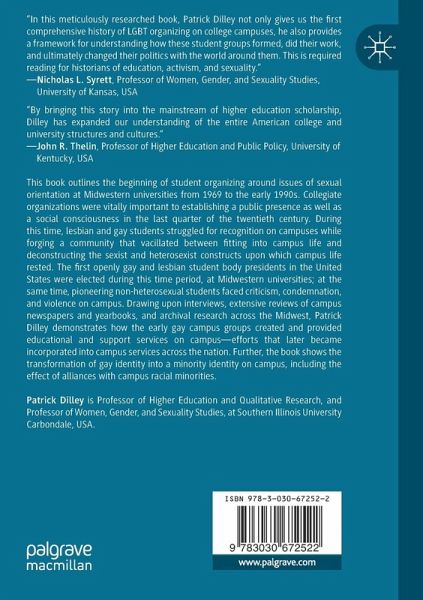 This book outlines the beginning of student organizing around issues of sexual orientation at Midwestern universities from 1969 to the early 1990s. Collegiate organizations were vitally important to establishing a public presence as well as a social consciousness in the last quarter of the twentieth century. During this time, lesbian and gay students struggled for recognition on campuses while forging a community that vacillated between fitting into campus life and deconstructing the sexist and heterosexist constructs upon which campus life rested. The first openly gay and lesbian student body presidents in the United States were elected during this time period, at Midwestern universities; at the same time, pioneering non-heterosexual students faced criticism, condemnation, and violence on campus. Drawing upon interviews, extensive reviews of campus newspapers and yearbooks, andarchival research across the Midwest, Patrick Dilley demonstrates how the early gay campus groups created and provided educational and support services on campus-efforts that later became incorporated into campus services across the nation. Further, the book shows the transformation of gay identity into a minority identity on campus, including the effect of alliances with campus racial minorities.