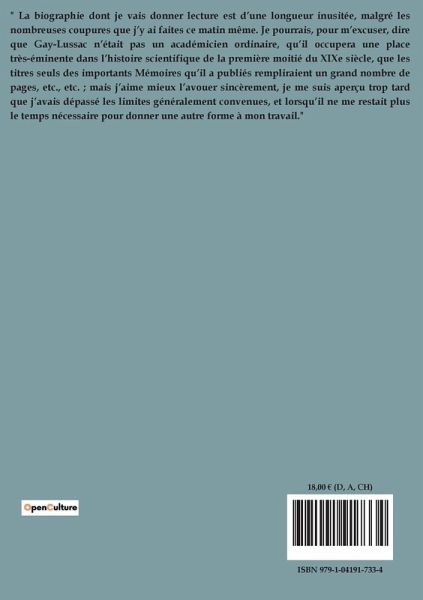 " La biographie dont je vais donner lecture est d¿une longueur inusitée, malgré les nombreuses coupures que j¿y ai faites ce matin même. Je pourrais, pour m¿excuser, dire que Gay-Lussac n¿était pas un académicien ordinaire, qüil occupera une place très-éminente dans l¿histoire scientifique de la première moitié du XIXe siècle, que les titres seuls des importants Mémoires qüil a publiés rempliraient un grand nombre de pages, etc., etc. ; mais j¿aime mieux l¿avouer sincèrement, je me suis aperçu trop tard que j¿avais dépassé les limites généralement convenues, et lorsqüil ne me restait plus le temps nécessaire pour donner une autre forme à mon travail."