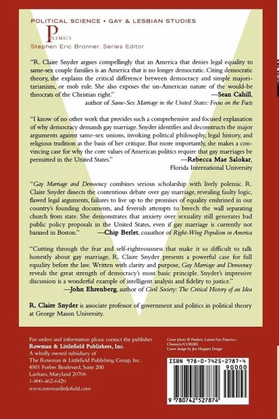 In this provocative new work, R. Claire Snyder argues that the fundamental principles of American democracy not only allow but require the legalization of same-sex marriage. In addition to explaining the theoretical issues at stake, the book provides a short history of marriage, disentangling its interpersonal, communal, religious and civil components.