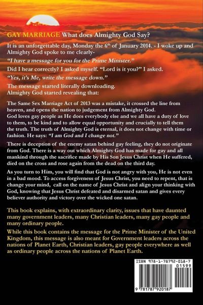 It is an unforgettable day, Monday the 6th of January 2014. - I woke up and Almighty God spoke to me clearly- "I have a message for you for the Prime Minister." Did I hear correctly? I asked myself. "Lord is it you?" I asked. "Yes, it's Me, write the message down." The message started literally downloading. Almighty God started revealing that: The Same Sex Marriage Act of 2013 was a mistake, it crossed the line from heaven, and opens the nation to judgement from Almighty God. God loves gay people as He does everybody else and we all have a duty of love to them, to be kind and to allow equal opportunity and crucially to tell them the truth. The truth of Almighty God is eternal, it does not change with time or fashion. He says: "I am God and I change not." There is deception of the enemy satan behind gay feeling, they do not originate from God. There is a way out which Almighty God has made for gay and all mankind through the sacrifice made by His Son Jesus Christ when He suffered, died on the cross and rose again from the dead on the third day. As you turn to Him, you will find that God is not angry with you, He is not even in a bad mood. To access forgiveness of Jesus Christ, you need to repent, that is change your mind, call on the name of Jesus Christ and align your thinking with God, knowing that Jesus Christ defeated and disarmed satan and gives every believer authority and victory over the wicked one satan. This book explains, with extraordinary clarity, issues that have daunted many government leaders, many Christian leaders, many gay people and many ordinary people. While this book contains the message for the Prime Minister of the United Kingdom, this message is also meant for Government leaders across the nations of Planet Earth, Christian leaders, gay people everywhere as well as ordinary people across the nations of Planet Earth.