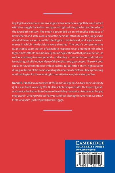 Daniel Pinello's exhaustive study analyzes how federal and state appellate courts treated the civil rights claims of lesbians and gay men between 1981 and 2000. Pinello examines 1,439 votes by 849 appellate judges in 398 decisions and opinions from 87 courts in all federal jurisdictions and 47 states. His investigation reveals that legal variables; judges' personal attributes; environmental factors (juridical ideology, consensual sodomy statutes, and gay civil rights laws); institutional determinants (judicial selection method and term length); and time and interest group participation were significant forces in judicial policymaking.