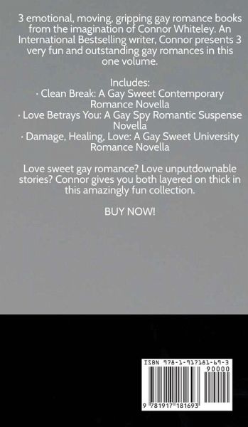 3 emotional, moving, gripping gay romance books from the imagination of Connor Whiteley. An International Bestselling writer, Connor presents 3 very fun and outstanding gay romances in this one volume. Includes: Clean Break: A Gay Sweet Contemporary Romance NovellaLove Betrays You: A Gay Spy Romantic Suspense NovellaDamage, Healing, Love: A Gay Sweet University Romance Novella Love sweet gay romance? Love unputdownable stories? Connor gives you both layered on thick in this amazingly fun collection. BUY NOW!