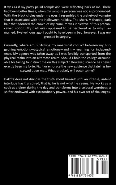 It was as if my pasty pallid complexion were reflecting back at me. There had been better times, when my vampire persona was not as pronounced. With the black circles under my eyes, I resembled the archetypal vampire that is associated with the Halloween holiday. The short, V-shaped, dark hair that adorned the crown of my cranium was indicative of this preconceived notion. My dark eyes appeared to be perplexed as to why I remained. Twelve hours ago, I ought to have been in bed; however, I was engrossed in surgery. Currently, where am I? Striking my innermost conflict between my burgeoning emotions-atypical emotions-and my yearning for independence. My agency was taken away as I was forcibly transported from the physical realm into an alternate realm. Should I hold the college accountable for failing to instruct me on this subject? However, science has never exactly been my forte. Fight or embrace the new existence that fate has bestowed upon me... What precisely will occur to me? Dakota does not disclose the truth about himself until an intense, ardent interlude has transpired; that is, he is not what he seems. He works as a cook at a diner during the day and transforms into a colossal werebear, a shifter endowed with extraordinary power...and his own set of challenges.