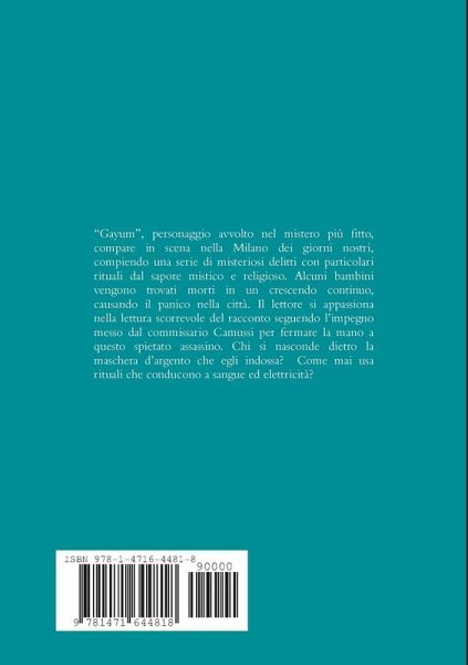 "Gayum", personaggio avvolto nel mistero più fitto, compare in scena nella Milano dei giorni nostri, compiendo una serie di misteriosi delitti con particolari rituali dal sapore mistico e religioso. Alcuni bambini vengono trovati morti in un crescendo continuo, causando il panico nella città. Il lettore si appassiona nella lettura scorrevole del racconto seguendo l'impegno messo dal commissario Camussi per fermare la mano a questo spietato assassino. Chi si nasconde dietro la maschera d'argento che egli indossa? Come mai usa rituali che conducono a sangue ed elettricità? La mente brillante del poliziotto darà la caccia a questo avversario capace sempre di anticiparlo in un susseguirsi di emozioni insolite. Immancabile nella bocca di Patrizio Camussi la sigaretta, elemento fondamentale per riordinare le idee. Come spesso accade nella vita, l'amore inaspettatamente piomberà addosso al commissario nel bel mezzo dell'indagine, con una forza capace di disturbare la logica dei suoi ragionamenti.