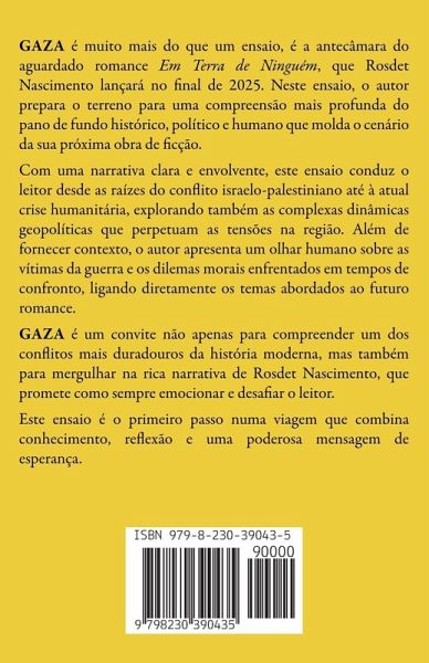 GAZA é muito mais do que um ensaio, é a antecâmara do aguardado romance Em Terra de Ninguém, que Rosdet Nascimento lançará no final de 2025. Neste ensaio, o autor prepara o terreno para uma compreensão mais profunda do pano de fundo histórico, político e humano que molda o cenário da sua próxima obra de ficção. Com uma narrativa clara e envolvente, este ensaio conduz o leitor desde as raízes do conflito israelo-palestiniano até à atual crise humanitária, explorando também as complexas dinâmicas geopolíticas que perpetuam as tensões na região. Além de fornecer contexto, o autor apresenta um olhar humano sobre as vítimas da guerra e os dilemas morais enfrentados em tempos de confronto, ligando diretamente os temas abordados ao futuro romance. GAZA é um convite não apenas para compreender um dos conflitos mais duradouros da história moderna, mas também para mergulhar na rica narrativa de Rosdet Nascimento, que promete como sempre emocionar e desafiar o leitor. Este ensaio é o primeiro passo numa viagem que combina conhecimento, reflexão e uma poderosa mensagem de esperança.