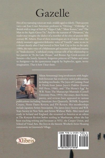 Five of my narrating voices are male, middle aged to elderly. Their accents varyan East Coast American professor in Driving, Oxbridge is British with a tinge of Irish in Hippo Club, Mose Konen, and The Man in the Apple-Green Tie. And for the narrator of Ostraneni, the reader may imagine the dialect of a member of the elite of ancient fifth century BC Athens. Four of these monologues are in a female voice: the elderly womans aggressive/defensive voice of Gazelle came to me in a dream shortly after I had moved to New York City to live in the early 1980s, the naive voice of a Midwestern girl recounts a childhood trauma in Snakedoctors, a subdued young woman tells of her relationship to her parents in At the Lake House, and Bronze Age Greek accents of Ismenethe lonely, hysteric, forgotten princess of Thebes and sister to Antigonein the eponymous tragedy by Sophocles, again, invite imagination. That is how I hear them.