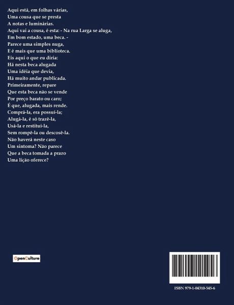 Aqui está, em folhas várias, Uma cousa que se presta A notas e luminárias. Aqui vai a cousa, é esta: - Na rua Larga se aluga, Em bom estado, uma beca. - Parece uma simples nuga, E é mais que uma biblioteca. Eis aqui o que eu diria: Há nesta beca alugada Uma idéia que devia, Há muito andar publicada. Primeiramente, repare Que esta beca não se vende Por preço barato ou caro; É que, alugada, mais rende. Comprá-la, era possuí-la; Alugá-la, é só trazê-la, Usá-la e restituí-la, Sem rompê-la ou descosê-la. Não haverá neste caso Um sintoma? Não parece Que a beca tomada a prazo Uma lição oferece?