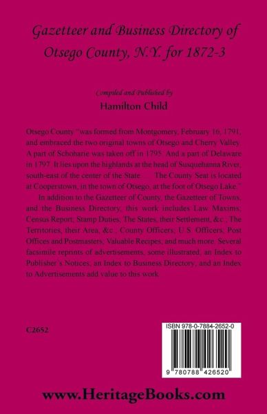Otsego County "was formed from Montgomery, February 16, 1791, and embraced the two original towns of Otsego and Cherry Valley. A part of Schoharie was taken off in 1795. And a part of Delaware in 1797. It lies upon the highlands at the head of Susquehanna River, south-east of the center of the State. ... The County Seat is located at Cooperstown, in the town of Otsego, at the foot of Otsego Lake." In addition to the Gazetteer of County, the Gazetteer of Towns, and the Business Directory, this work includes Law Maxims; Census Report; Stamp Duties; The States, their Settlement, &c.; The Territories, their Area, &c.; County Officers; U.S. Officers; Post Offices and Postmasters; Valuable Recipes; and much more. Several facsimile reprints of advertisements, some illustrated; an Index to Publisher's Notices; an Index to Business Directory; and an Index to Advertisements add value to this work.