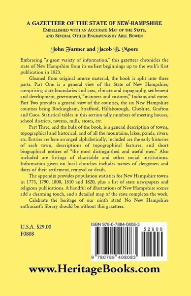 Embracing "a great variety of information," this gazetteer chronicles the state of New Hampshire from its earliest beginnings up to the work's first publication in 1823. Gleaned from original source material, the book is split into three parts. Part One is a general view of the State of New Hampshire, comprising state boundaries and area, climate and topography, settlement and development, government, "manners and customs," Indians and more. Part Two provides a general view of the counties, the six New Hampshire counties being Rockingham, Strafford, Hillsborough, Cheshire, Grafton and Coos. Statistical tables in this section tally numbers of meeting houses, school districts, taverns, mills, stores, etc. Part Three, and the bulk of the book, is a general description of towns, topographical and historical, and of all the mountains, lakes, ponds, rivers, etc. Entries are here arranged alphabetically; included are the early histories of each town, descriptions of topographical features, and short biographical notices of "the most distinguished and useful men." Also included are listings of charitable and other social institutions. Information given on local churches includes names of clergymen and dates of their settlement, removal or death. The appendix provides population statistics for New Hampshire towns in 1775, 1790, 1800, 1810 and 1820, plus a list of state newspapers and religious publications. A handful of illustrations of New Hampshire scenes add a charming touch, and a detailed map of the state completes the work. Celebrate the heritage of our ninth state! No New Hampshire enthusiast's library should be without this gazetteer.