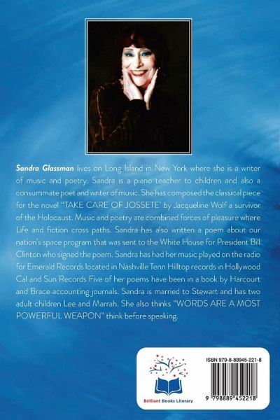 Sandra Glassman lives on Long Island in New York where she is a writer of music and poetry. Sandra is a piano teacher to children and also a consummate poet and writer of music. She has composed the classical piece for the novel "TAKE CARE OF JOSSETE' by Jacqueline Wolf a survivor of the Holocaust. Music and poetry are combined forces of pleasure where Life and fiction cross paths. Sandra has also written a poem about our nation's space program that was sent to the White House for President Bill Clinton who signed the poem. Sandra has had her music played on the radio for Emerald Records located in Nashville Tenn Hilltop records in Hollywood Cal and Sun Records Five of her poems have been in a book by Harcourt and Brace accounting journals. Sandra is married to Stewart and has two adult children Lee and Marrah. She also thinks "WORDS ARE A MOST POWERFUL WEAPON" think before speaking.