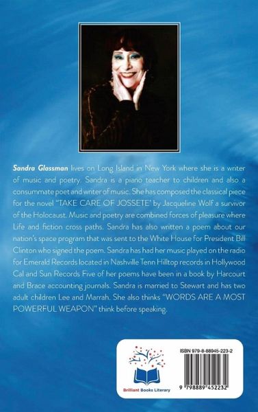 Sandra Glassman lives on Long Island in New York where she is a writer of music and poetry. Sandra is a piano teacher to children and also a consummate poet and writer of music. She has composed the classical piece for the novel "TAKE CARE OF JOSSETE' by Jacqueline Wolf a survivor of the Holocaust. Music and poetry are combined forces of pleasure where Life and fiction cross paths. Sandra has also written a poem about our nation's space program that was sent to the White House for President Bill Clinton who signed the poem. Sandra has had her music played on the radio for Emerald Records located in Nashville Tenn Hilltop records in Hollywood Cal and Sun Records Five of her poems have been in a book by Harcourt and Brace accounting journals. Sandra is married to Stewart and has two adult children Lee and Marrah. She also thinks "WORDS ARE A MOST POWERFUL WEAPON" think before speaking.