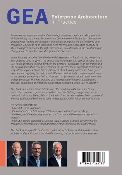Governmental, organisational and technological developments are taking place at an increasingly rapid pace. Structures are becoming more flexible and new service and business models are necessary to maintain or improve the performance of an enterprise. This leads to an increasing need for enterprise governing capacity to allow managers to choose the right direction for an enterprise in the event of major changes, and to maintain and strengthen its coherence. In this book we describe how the General Enterprise Architecting (GEA) governing instrument is used to govern the enterprises' coherence. The central assumption of GEA is the direct relationship between the degree of coherence in an enterprise and the performance of an enterprise, making the governance of enterprise coherence a very interesting idea. Since the development of GEA, many enterprises have gained experience in applying the instrument; GEA has contributed in many different ways to the managing capacity of enterprises and has proven its value in solving complex enterprise issues. This has provided us with a wealth of information about the practical application of enterprise architecture according to the GEA philosophy. This book is intended for architects and other professionals who want to use 'enterprise coherence governance' in their practice. Solving enterprise issues is central to this book. We explain on the basis of a concrete roadmap how 'coherence' is made explicit and how this is used to develop a solution for an enterprise issue. We further elaborate on: ¿ how GEA works in practice ¿ the relationship of GEA with portfolio management and agile working ¿ the design of the enterprise architecture function and the measurement of its maturity ¿ how GEA can be combined with other tools, such as strategic governing tools, enterprise architecture methods and frameworks, and reference architectures This book is designed to enable the reader to 'do' GEA and to fit it into their daily architectural practice, with the aim of improving the performance of enterprises.