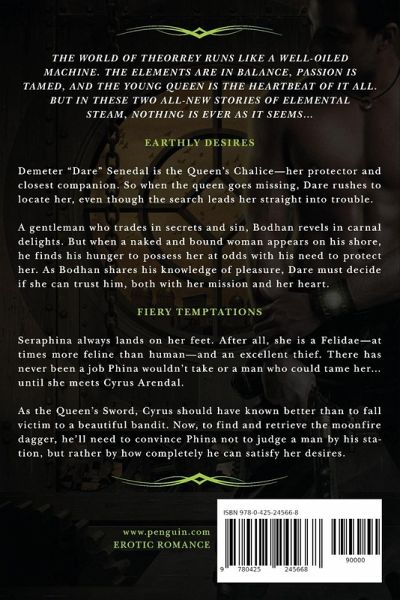 The world of Theorrey runs like a well-oiled machine. The elements are in balance, passion is tamed and the young queen is the heartbeat of it all. But in these two all-new stories of elemental steam, nothing is ever as it seems... Earthly Desires Demeter "Dare" Senedal is the Queen's Chalice-her protector and closest companion. So when the queen goes missing, Dare rushes to locate her, even though the search leads her straight into trouble. A gentleman who trades in secrets and sin, Bodhan revels in carnal delights, but when a naked and bound woman appears on his shore, he finds his hunger to possess at odds with his need to protect. As Bodhan shares his knowledge of pleasure, Dare must decide if she can trust him, both with her mission and her heart. Fiery Temptations Seraphina always lands on her feet. After all, she is a Felidae-at times more feline than human-and an excellent thief. There has never been a job Phina wouldn't take or a man who could tame her...until she meets Cyrus Arendal. As the Queen's Sword, Cyrus should have known better than to fall victim to a beautiful bandit. Now, to find and retrieve the moonfire dagger, he'll need to convince Phina not to judge a man by his station, but rather by how completely he can satisfy her desires.