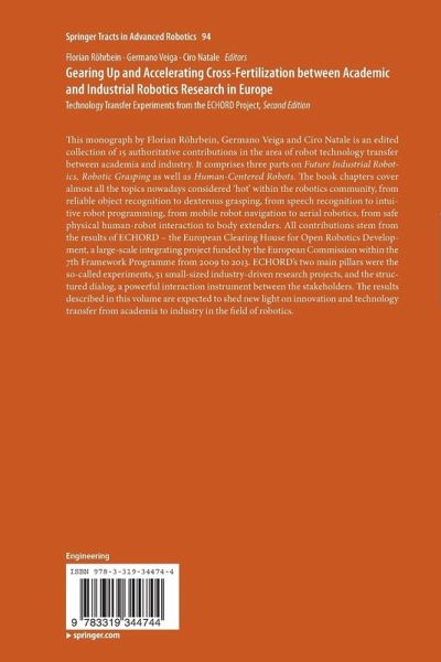 This monograph by Florian Röhrbein, Germano Veiga and Ciro Natale is an edited collection of 15 authoritative contributions in the area of robot technology transfer between academia and industry. It comprises three parts on Future Industrial Robotics , Robotic Grasping as well as Human-Centered Robots. The book chapters cover almost all the topics nowadays considered 'hot' within the robotics community, from reliable object recognition to dexterous grasping, from speech recognition to intuitive robot programming, from mobile robot navigation to aerial robotics, from safe physical human-robot interaction to body extenders. All contributions stem from the results of ECHORD - the European Clearing House for Open Robotics Development, a large-scale integrating project funded by the European Commission within the 7th Framework Programme from 2009 to 2013. ECHORD's two main pillars were the so-called experiments, 51 small-sized industry-driven research projects and the structured dialog a powerful interaction instrument between the stakeholders. The results described in this volume are expected to shed new light on innovation and technology transfer from academia to industry in the field of robotics.