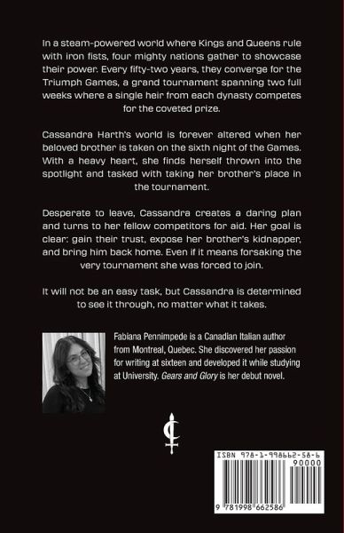 In a steam-powered world where Kings and Queens rule with iron fists, four mighty nations gather to showcase their power. Every fifty-two years, they converge for the Triumph Games, a grand tourney spanning two full weeks where a single heir from each dynasty competes for the coveted prize. Cassandra Harth's world is forever altered when her beloved brother is taken on the sixth night of the Games. With a heavy heart, she finds herself thrown into the spotlight and tasked with taking her brother's place in the tournament. Desperate to leave, Cassandra creates a daring plan and turns to her fellow competitors for aid. Her goal is clear: gain their trust, expose her brother's kidnapper, and bring him back home. Even if it means forsaking the very tournament she was forced to join. It will not be an easy task, but Cassandra is determined to see it through, no matter what it takes. Fabiana Pennimpede is a Canadian Italian author from Montreal, Quebec. She discovered her passion for writing at sixteen and developed it while studying at University. Gears and Glory is her debut novel.