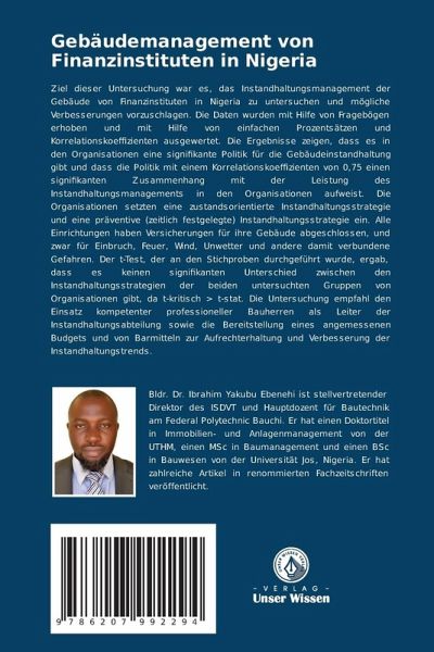 Ziel dieser Untersuchung war es, das Instandhaltungsmanagement der Gebäude von Finanzinstituten in Nigeria zu untersuchen und mögliche Verbesserungen vorzuschlagen. Die Daten wurden mit Hilfe von Fragebögen erhoben und mit Hilfe von einfachen Prozentsätzen und Korrelationskoeffizienten ausgewertet. Die Ergebnisse zeigen, dass es in den Organisationen eine signifikante Politik für die Gebäudeinstandhaltung gibt und dass die Politik mit einem Korrelationskoeffizienten von 0,75 einen signifikanten Zusammenhang mit der Leistung des Instandhaltungsmanagements in den Organisationen aufweist. Die Organisationen setzten eine zustandsorientierte Instandhaltungsstrategie und eine präventive (zeitlich festgelegte) Instandhaltungsstrategie ein. Alle Einrichtungen haben Versicherungen für ihre Gebäude abgeschlossen, und zwar für Einbruch, Feuer, Wind, Unwetter und andere damit verbundene Gefahren. Der t-Test, der an den Stichproben durchgeführt wurde, ergab, dass es keinen signifikanten Unterschied zwischen den Instandhaltungsstrategien der beiden untersuchten Gruppen von Organisationen gibt, da t-kritisch > t-stat. Die Untersuchung empfahl den Einsatz kompetenter professioneller Bauherren als Leiter der Instandhaltungsabteilung sowie die Bereitstellung eines angemessenen Budgets und von Barmitteln zur Aufrechterhaltung und Verbesserung der Instandhaltungstrends.