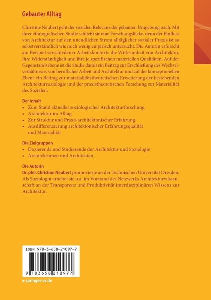 Christine Neubert geht der sozialen Relevanz der gebauten Umgebung nach. Mit ihrer ethnografischen Studie schließt sie eine Forschungslücke, denn der Einfluss von Architektur auf den unendlichen Strom alltäglicher sozialer Praxis ist so selbstverständlich wie noch wenig empirisch untersucht. Die Autorin erforscht am Beispiel verschiedener Arbeitskontexte die Wirksamkeit von Architektur, ihre Widerständigkeit und ihre je spezifischen materiellen Qualitäten. Auf der Gegenstandsebene ist die Studie damit ein Beitrag zur Erschließung des Wechselverhältnisses von beruflicher Arbeit und Architektur und auf der konzeptionellen Ebene ein Beitrag zur materialitätstheoretischen Erweiterung der bestehenden Architektursoziologie und der praxistheoretischen Forschung zur Materialität des Sozialen.