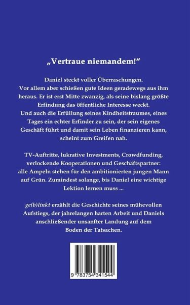 "Vertraue niemandem!" Daniel steckt voller Überraschungen. Vor allem aber schießen gute Ideen geradewegs aus ihm heraus. Er ist erst Mitte zwanzig, als seine bislang größte Erfindung das öffentliche Interesse weckt. Und auch die Erfüllung seines Kindheitstraumes, eines Tages ein echter Erfinder zu sein, der sein eigenes Geschäft führt und damit sein Leben finanzieren kann, scheint zum Greifen nah. TV-Auftritte, lukrative Investments, Crowdfunding, verlockende Kooperationen und Geschäftspartner: alle Ampeln stehen für den ambitionierten jungen Mann auf Grün. Zumindest solange, bis Daniel eine wichtige Lektion lernen muss. "ge(b)linkt" erzählt die Geschichte seines mühevollen Aufstiegs, der jahrelangen harten Arbeit und Daniels anschließender unsanften Landung auf dem Boden der Tatsachen. Bekannt aus der TV-Show: 2 Minuten, 2 Millionen!