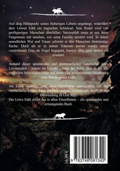 Ausgerechnet auf dem Höhepunkt seines bisherigen Lebens widerfährt dem Löwen Eddi ein tragisches Schicksal. Sein Rudel wird von profitgierigen Menschen überfallen. Verzweifelt muss er aus den Fängen ihrer Netze mit anschauen, wie seine Familie zerstört wird. In seiner unendlichen Wut und Trauer schwört er den Menschen blutrünstige Rache. Doch dann kommt alles ganz anders als erwartet. Anhand dieser spannenden und abenteuerlichen Geschichte eines Löwenrudels zeigt der Autor, dass es für alle tragischen Schicksalsschläge und ausweglos erscheinenden Situationen eine Wende geben kann.Als Leser überträgt man diese Geschichte unweigerlich auf das menschliche Leben. Man erkennt, welche verändernde Kraft in der Hinwendung zu Gott liegt. Der Löwe Eddi erlebt das in allen Einzelheiten - ein spannendes und ermutigendes Buch.