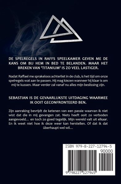 De spelregels in Raffs speelkamer geven me de kans om bij hem in bed te belanden. Maar het breken van 'Titanium' is zo veel lastiger. Nadat Raffael me sprakeloos achterliet in de club, is het tijd om onze spelregels wat aan te passen. Hij mag kiezen wanneer hij klaar is om mij te kussen. Maar verder zal vanaf nu alles mijn beslissing zijn. Sebastian is de gevaarlijkste uitdaging waarmee ik ooit geconfronteerd ben. Zijn aanraking bevrijdt de ketenen van een passie waarvan ik niet wist dat die in mij gevangen zat. Niets heeft ooit zo verboden aangevoeld... en toch zo goed tegelijk. Mijn wereld valt uit elkaar. En ik weet niet hoe ik deze weer kan herstellen. Of dat ik dat überhaupt wel wil... Complete serie: GEBROKEN 1. Gebroken Regels 2. Gebroken Grenzen 3. Gebroken Titanium