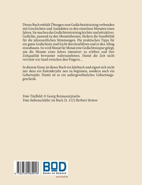 Dieses Buch enthält Übungen zum Gedächtnistraining verbunden mit Geschichten und Anekdoten zu den einzelnen Monaten eines Jahres. Sie machen das Gedächtnistraining leichter und attraktiver. Gedichte, passend zu den Monatsthemen, fördern die Sensibilität für die jahreszeitlichen Stimmungen. Die praktischen Tipps für ein gutes Gedächtnis sind leicht durchzuführen und in den Alltag einzubauen. So wird Monat für Monat eine Gedächtnisspur gelegt, um die Monate eines Jahres intensiver zu erleben und ihre Zeitqualität bewusster wahrzunehmen. Damit die Zeit nicht so zerrinnt wie Sand zwischen den Fingern...In diesem Sinne ist dieses Buch ein Jahrbuch und eignet sich nicht nur dazu ein Kalenderjahr neu zu beginnen, sondern auch ein Geburtsjahr. Damit ist es ein außergewöhnliches Geburtstagsgeschenk.